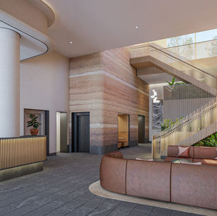 The design of the two new residential towers at 1900 Crystal Drive will be a catalyst in the ongoing transformation of National Landing to a human-centric, mixed-use, lively neighborhood. The buildings look to the edge of the district’s wooded parkland along the curving Potomac banks to inform their design and provide an armature for plant life through a series of terrace gardens and loggias. South Tower (pictured above) has a more organic, earthy and playful mood contrasted by North Tower which is more chic and geometric with some pops of color.